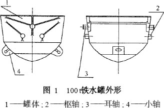 鐵水罐是冶金行業(yè)使用非常廣泛的一種設備,它的作用是裝運煉鐵廠生產(chǎn)出來的鐵水,并通過鐵水罐車將其運送到鑄鐵車間鑄鐵或煉鋼廠煉鋼。煉鐵廠100 t鐵水罐型號為ZT -100 - 1型,其結(jié)構(gòu)的特點是罐臂(包括圖1所示2, 3部分)采用鑄造,罐身采用焊接,罐臂與罐身互焊。