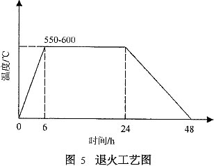 殘余應力會引起鋼件在使用一定時間以后,或在隨后的切削加工中產(chǎn)生變形或裂紋。耳軸退火主要用來消除堆焊造成的殘余應力、細化金相組織。采用局部退火裝置:制作一鋼筒,鋼筒內(nèi)、外襯石棉,內(nèi)盤電熱絲;鋼筒一端開口,套在耳軸上開口部與包體焊接固定;退火時鋼筒四周覆石棉,鋼包內(nèi)耳軸位置覆石棉;對每只鐵水罐退火過程嚴格按照圖5所示溫度曲線要求。