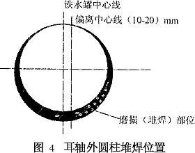 對煉鐵廠100 t鐵水罐的耳軸磨損進行了分析,通過耳軸彎曲強度核算,確認需修復磨損量。通過對焊縫強度校核,證明更換耳軸的方案不可行,從而選用耳軸表面堆焊的處理工。焊后采用退火處理,以消除焊接殘余應力,效果良好。